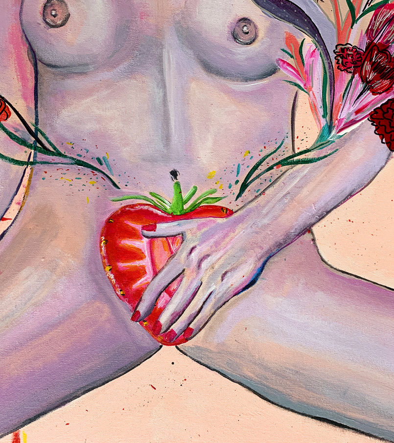 A Pleasure Place is a celebration of women’s emancipation and sexual freedom. I wanted to represent the desires that women were told to repress in a patriarchal society for such a long time. I want to show in a beautiful and celebratory way how important it is to know our own body and appropriate it in a healthy way, without accepting sexual stereotypes and false ideas created by pornography and media. The use of flowers and fruits represent the liberated desires in a way that I want to pay homage to the work of female artists that I admire such as Judy Chicago with her work The Dinner Party. I tried to portray various types of women as I hope to be inclusive and embrace diversity even though I did not have access to a variety of models for this work. I hope that with this series viewers will be able to see the beauty of women, feel the celebration of pleasure that is expressed through their bodies, and understand the freedom that every woman deserves to experience.